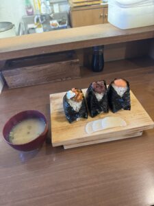 左から漬けサーモンクリチ、とろたく、自家製明太マヨです。